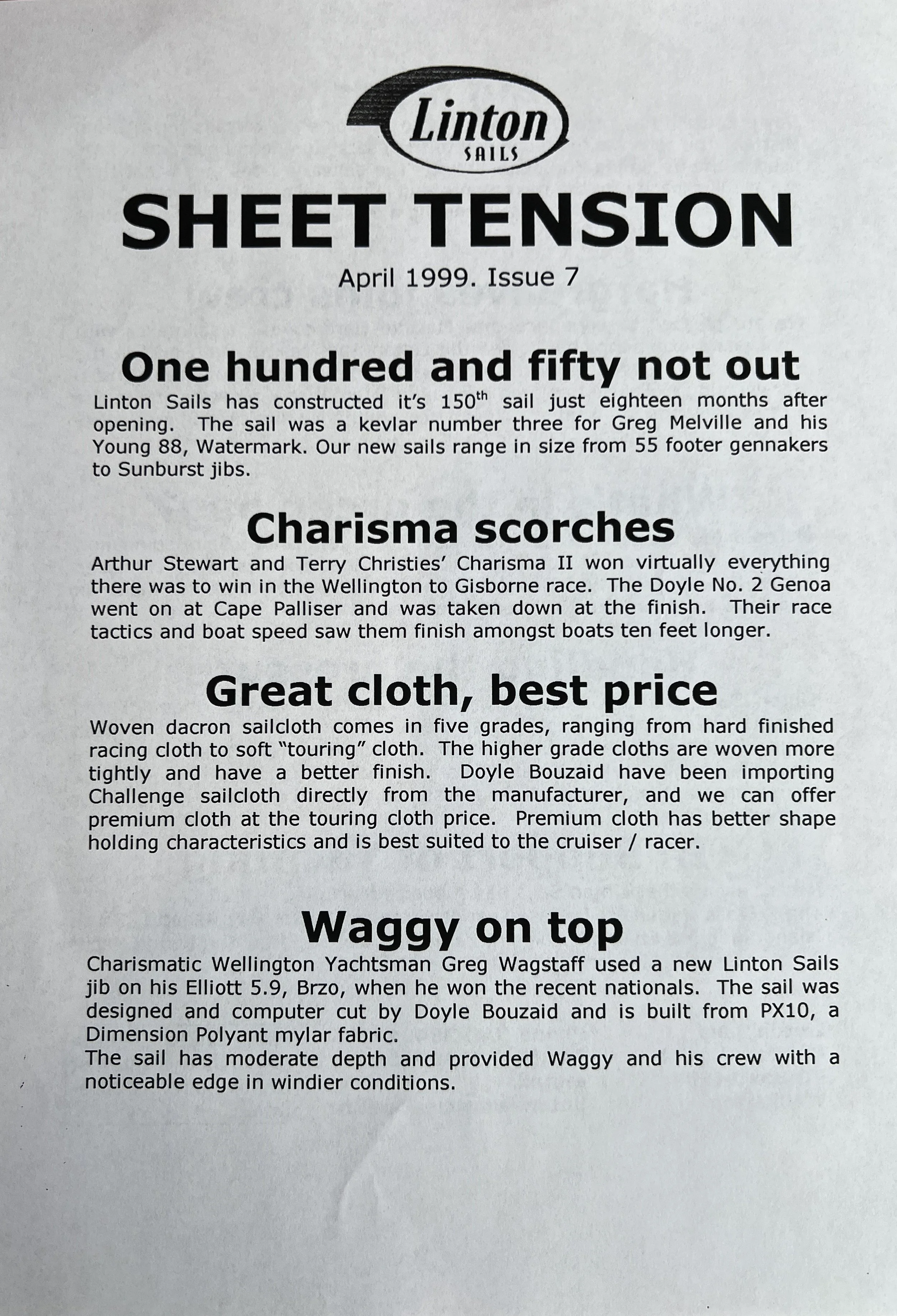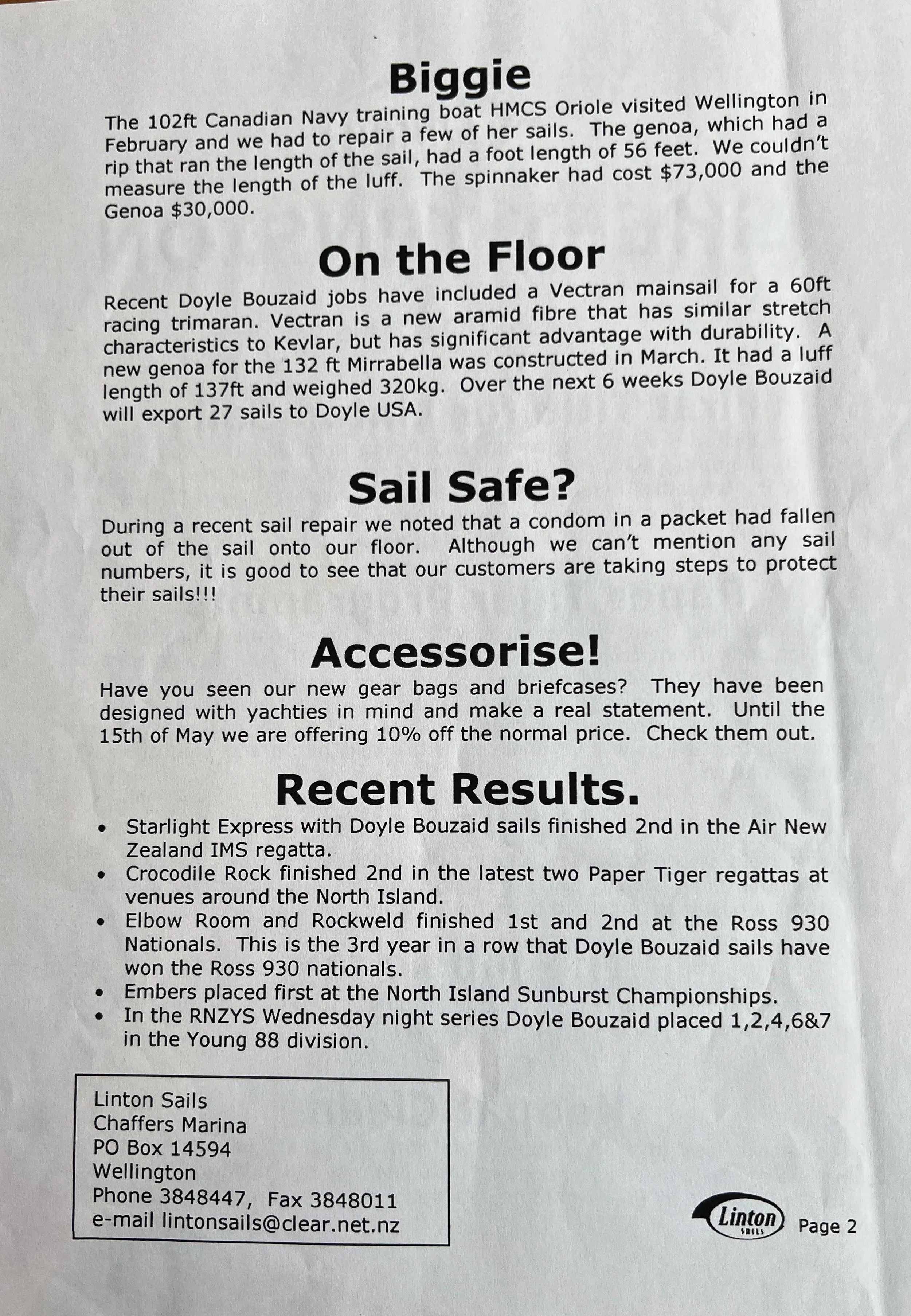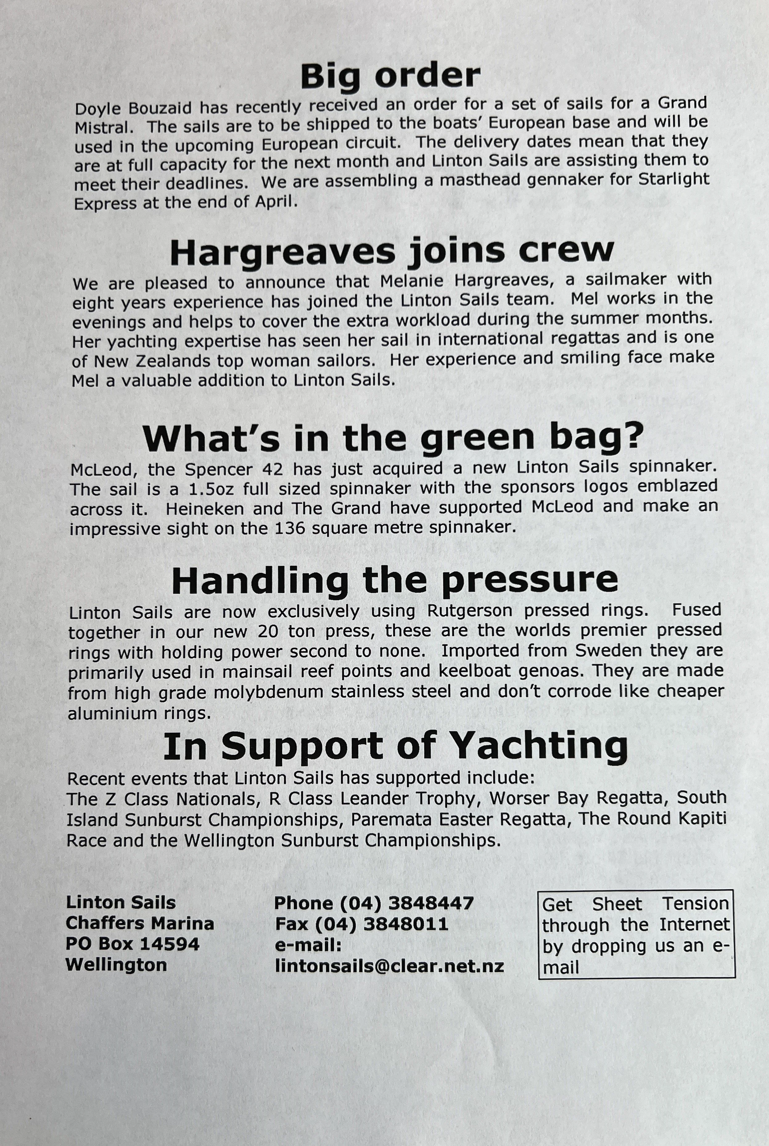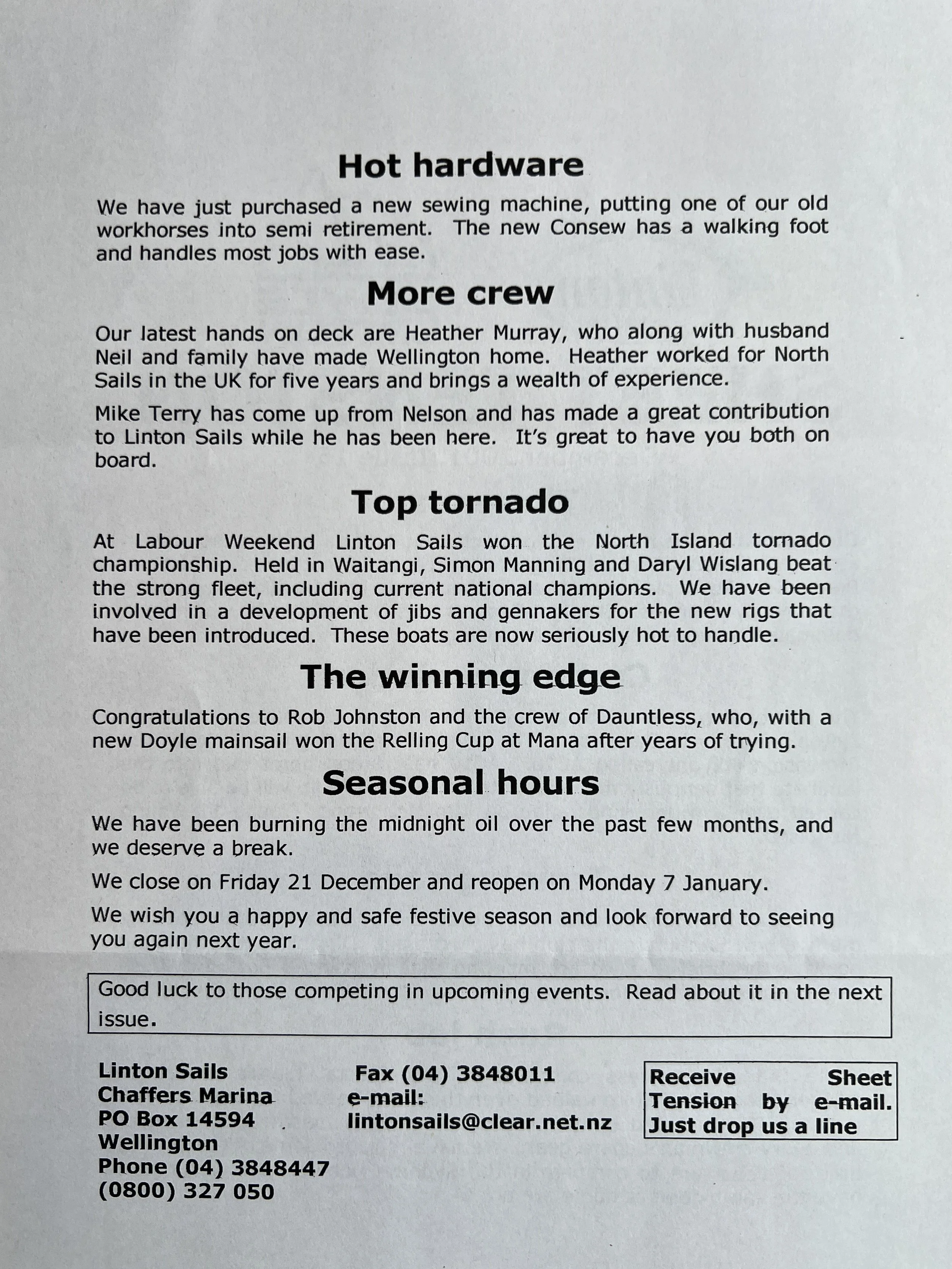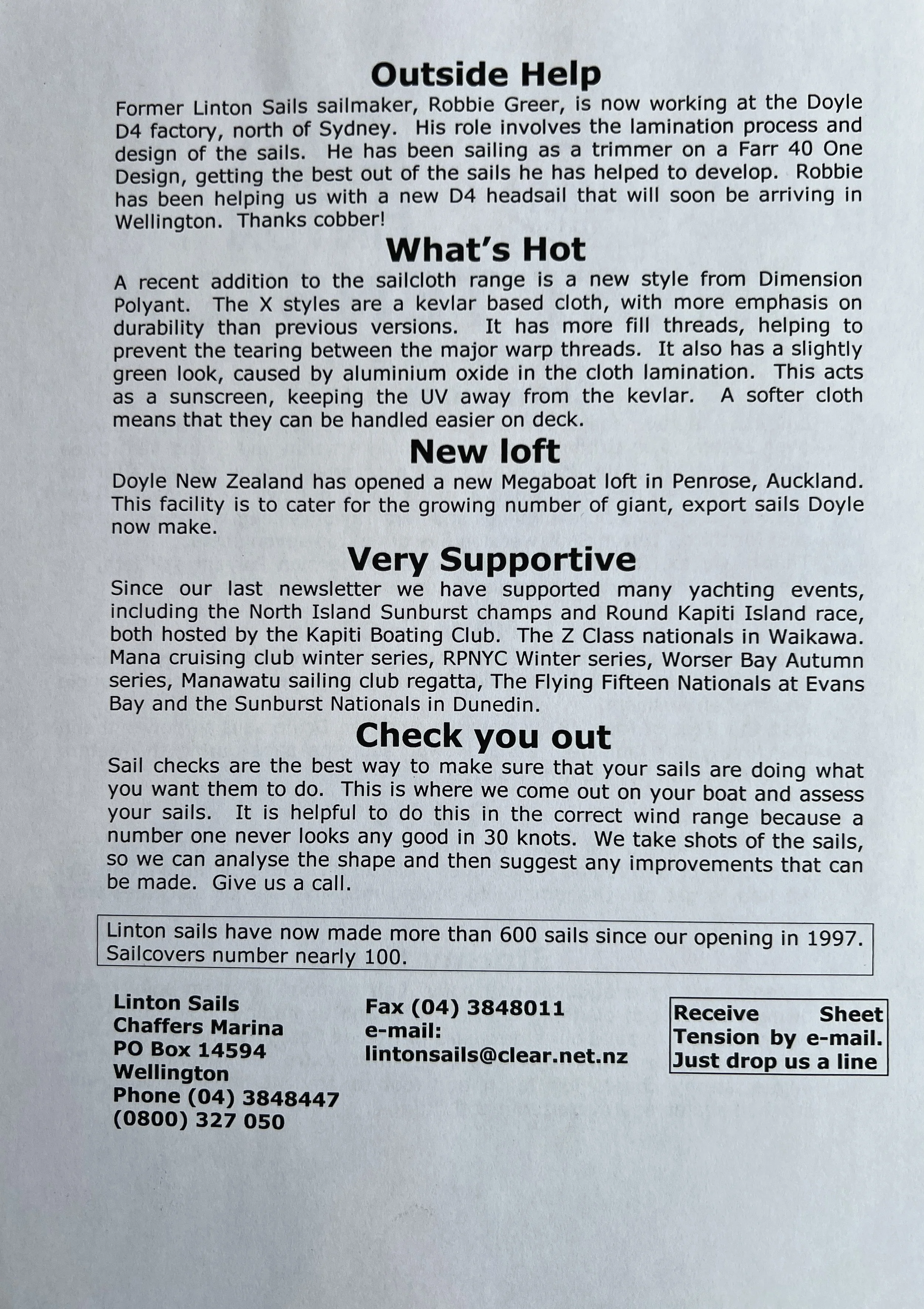 When Linton Sails began in 1997, we would post out a newsletter to local sailors as a way to increase awareness and get business. Recently we discovered old copies and reminisced as we read through them.