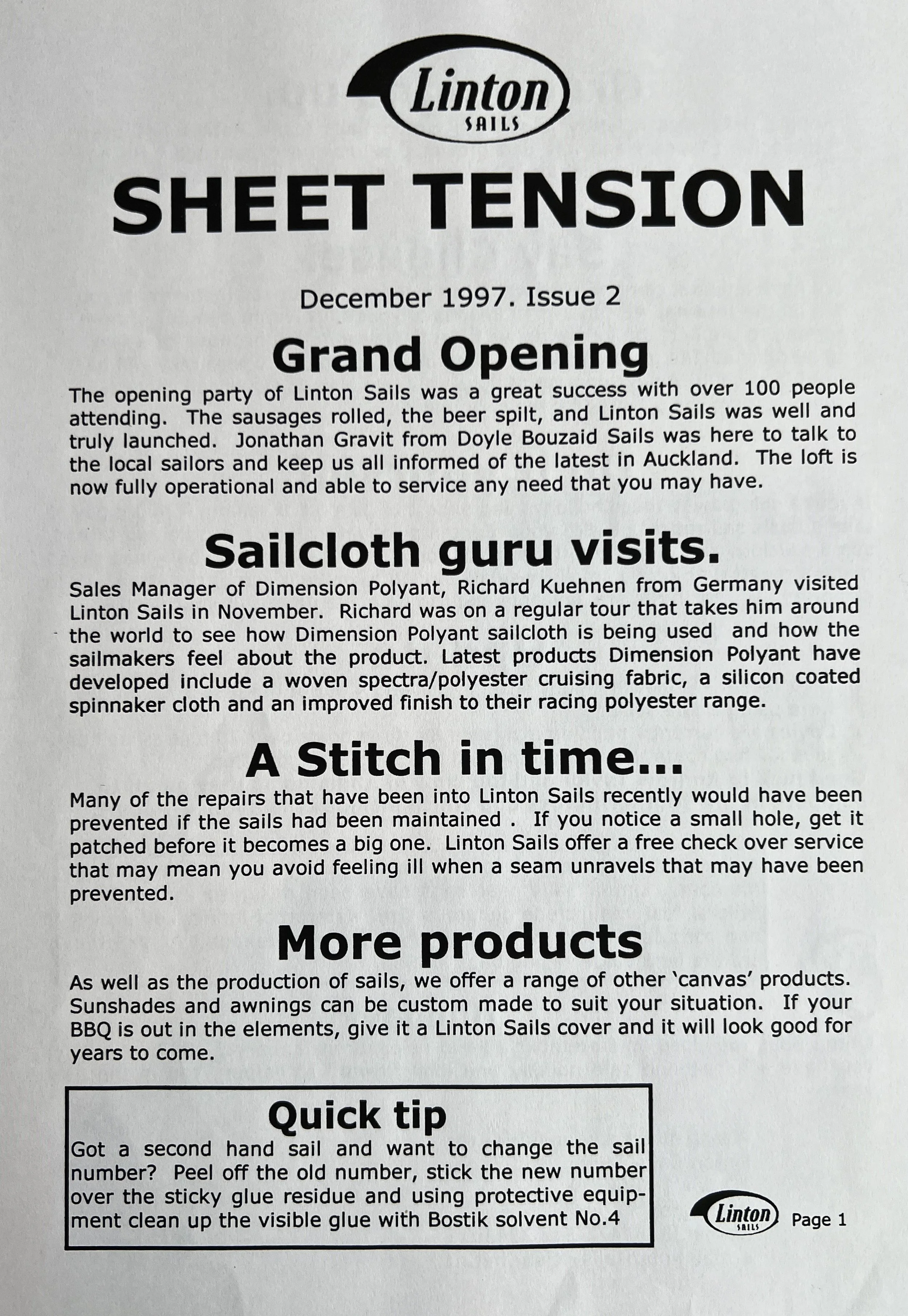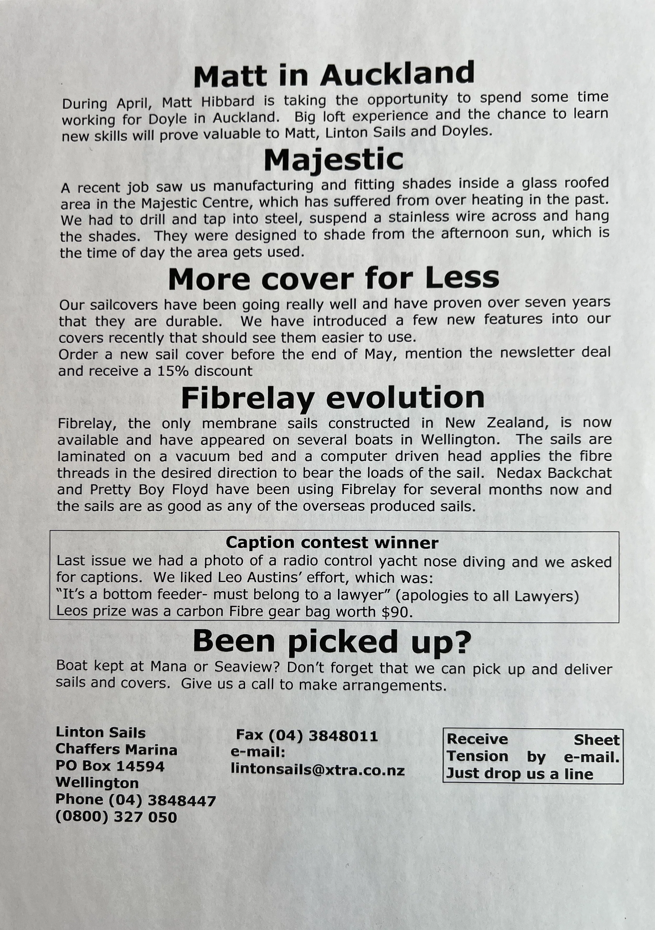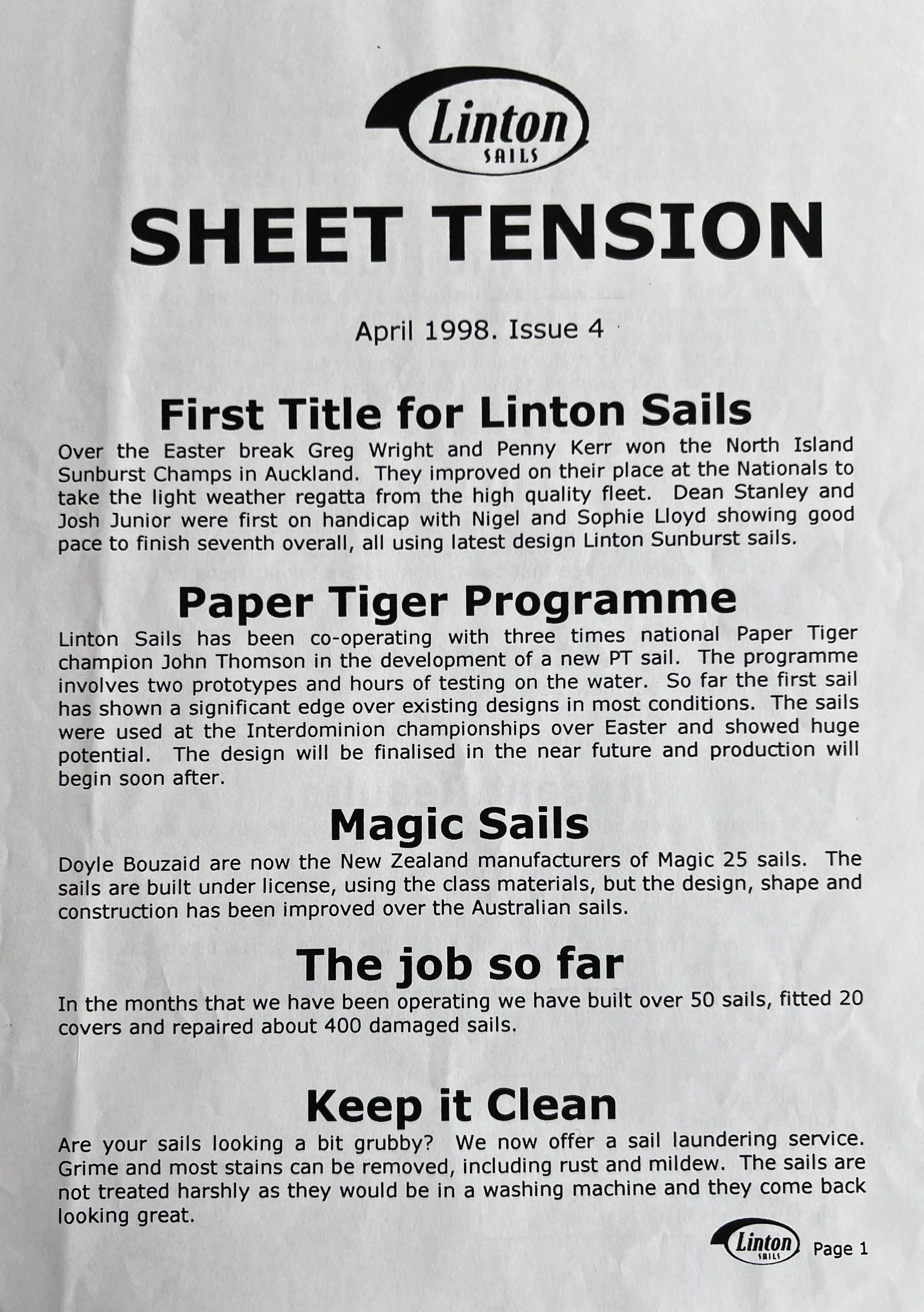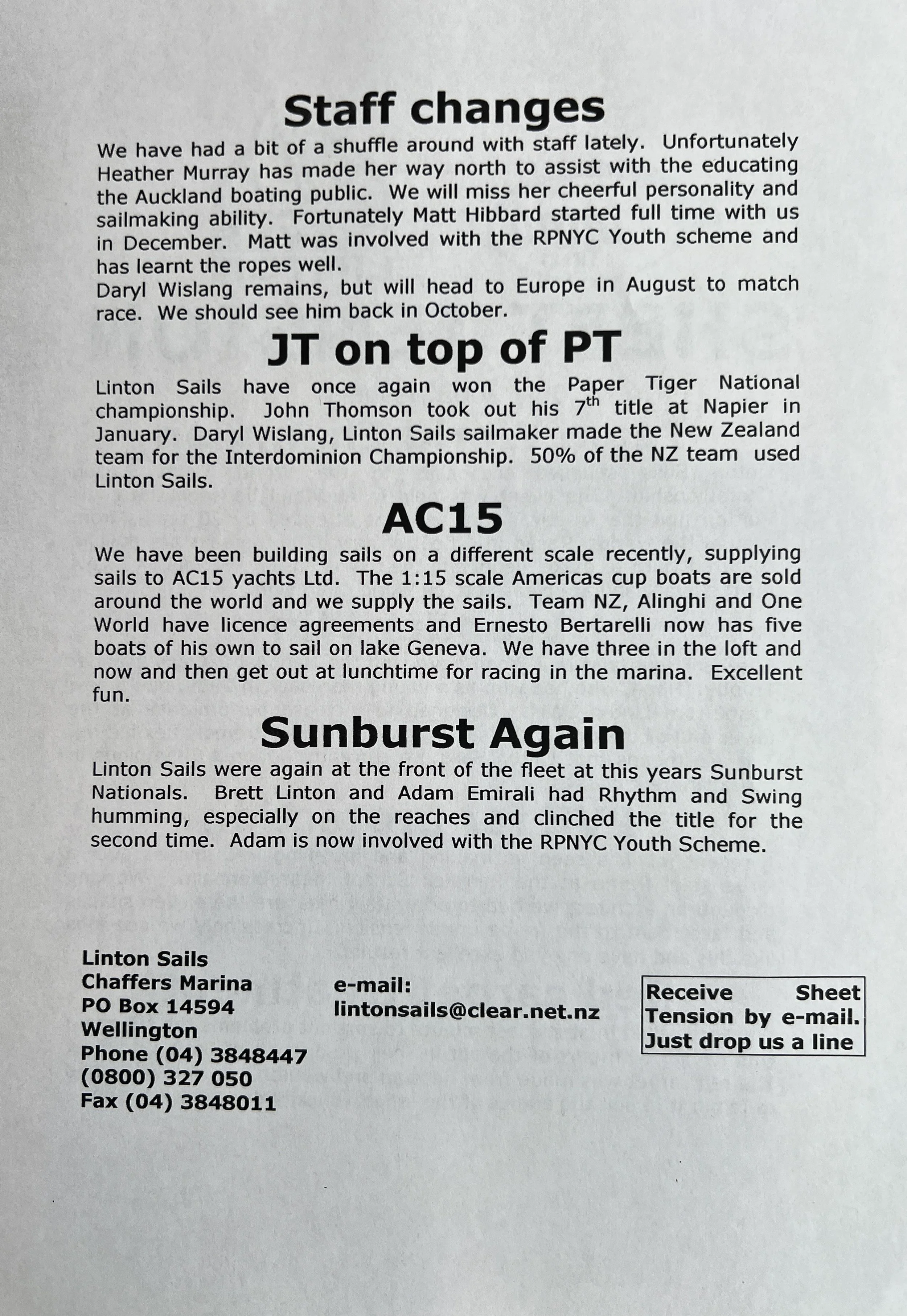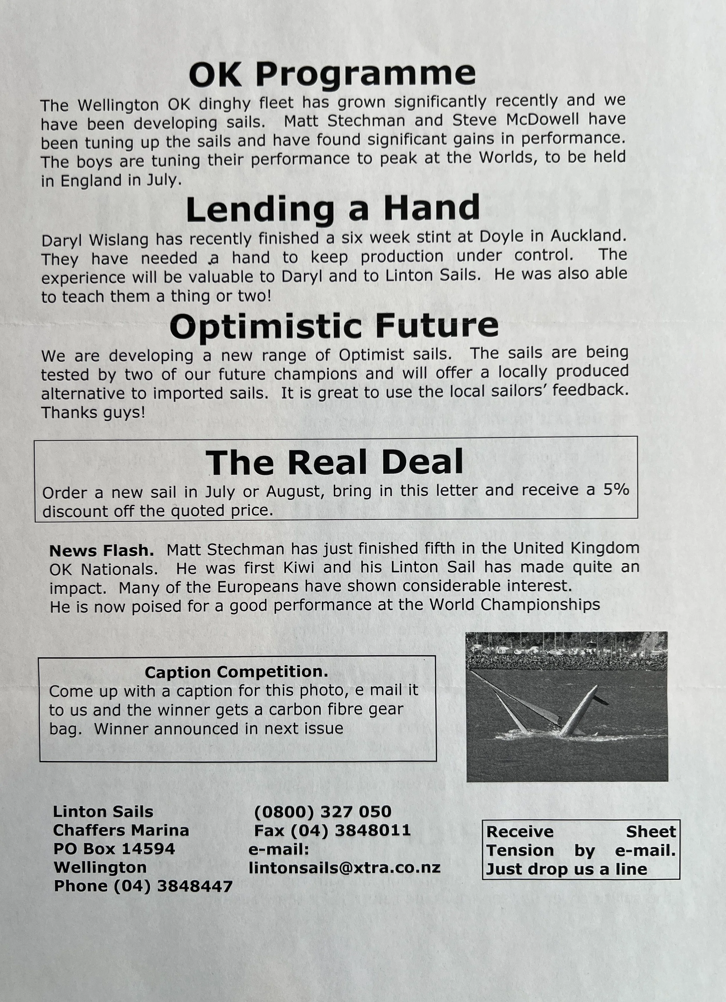 When Linton Sails began in 1997, we would post out a newsletter to local sailors as a way to increase awareness and get business. Recently we discovered old copies and reminisced as we read through them.