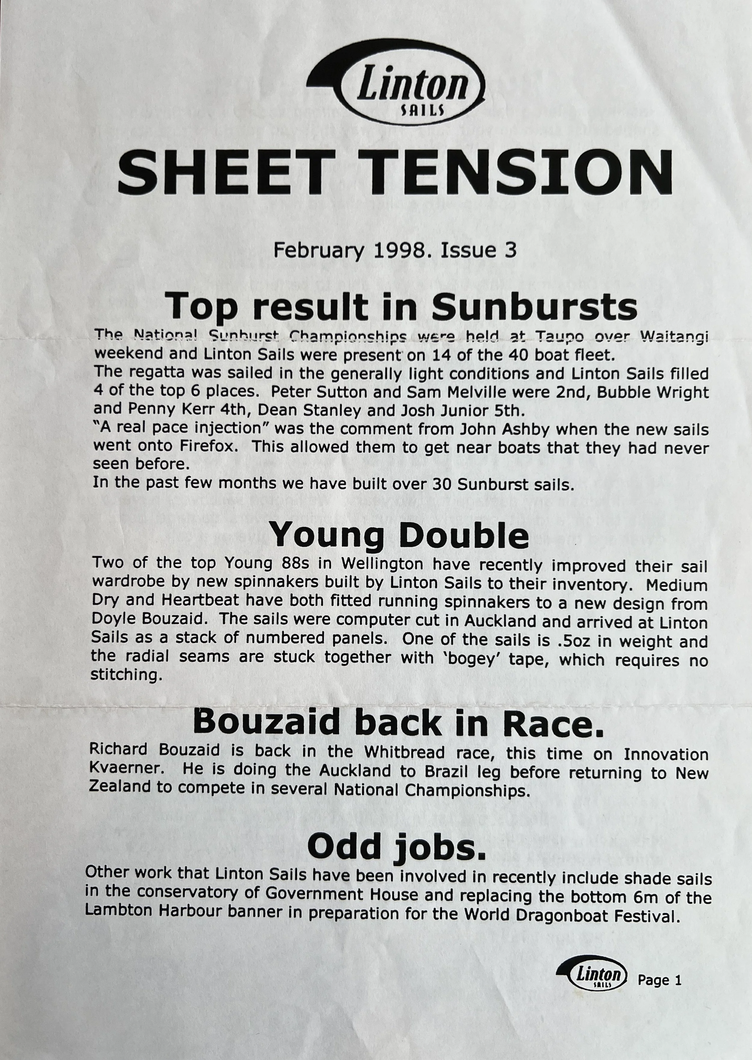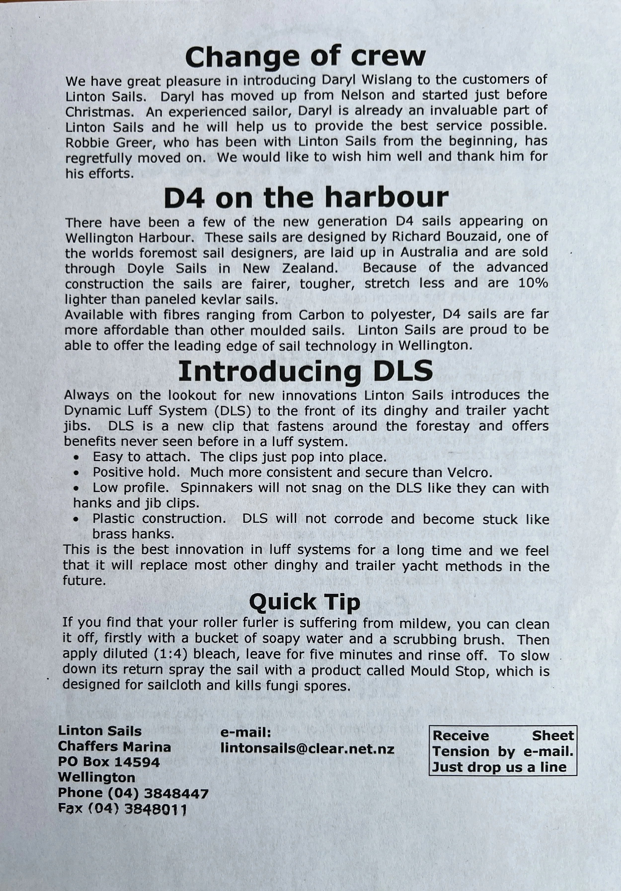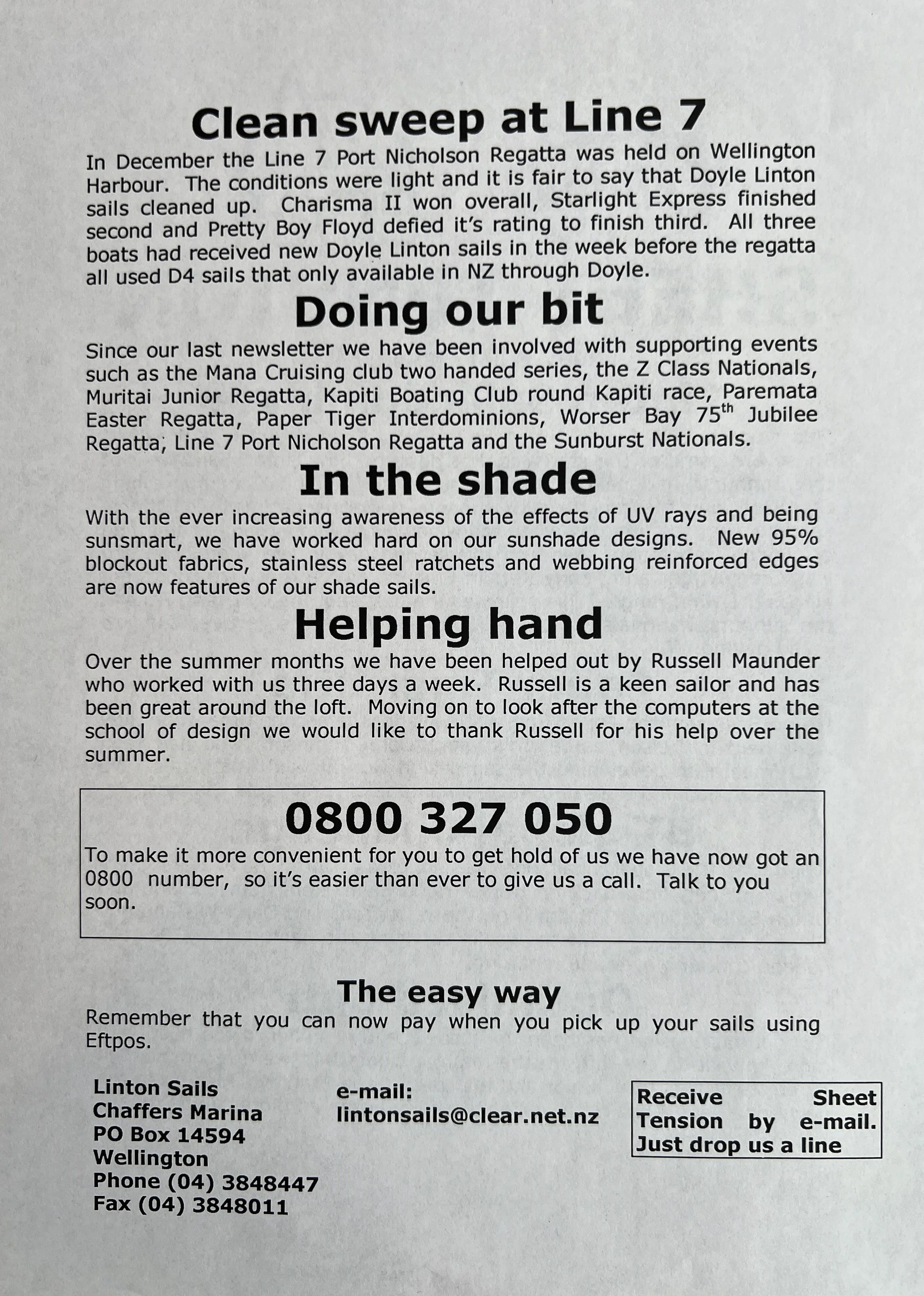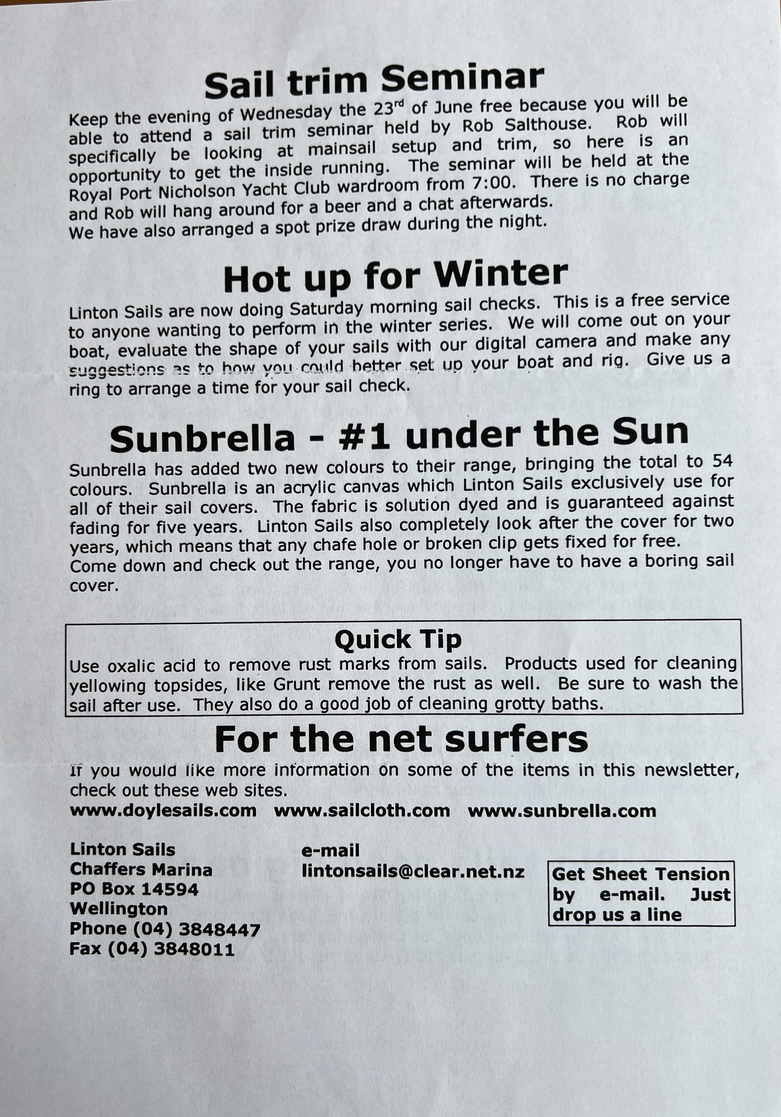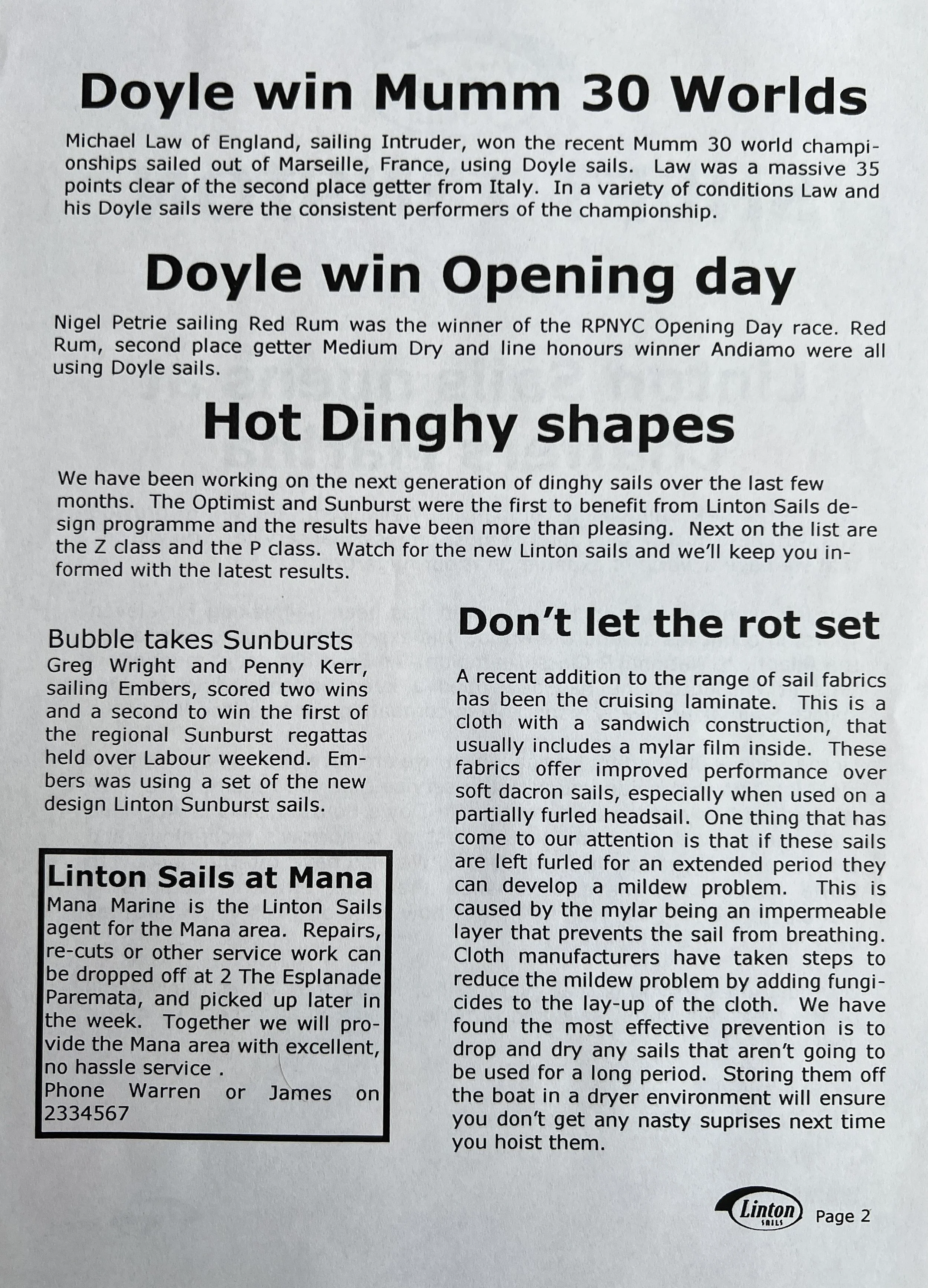 When Linton Sails began in 1997, we would post out a newsletter to local sailors as a way to increase awareness and get business. Recently we discovered old copies and reminisced as we read through them.